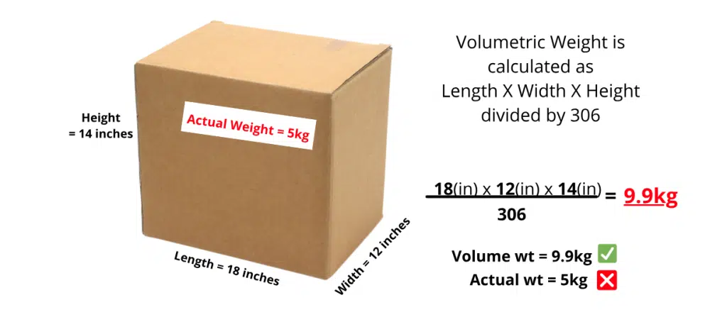 In the scenario below the chargeable weight for this box is 9.9kg although the actual weight is 5kg. The total cost of shipping this box ould be 9.9kg x $15 = $148.50